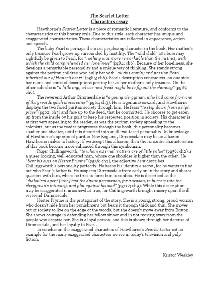 Also, Hester went through public embarrassment alone because she wanted to protect his lover, Dimmesdale, scarlet letter essays, from suffering which she had already gone through. She was just alienated from the public and lived her life for raising her daughter. In addition, Hawthorne uses Dimmesdale to represent the theme of guilt and hypocrisy by telling readers that the pain of guilt is far greater than the pain of shame and the pain that he suffered from being scarlet letter essays hypocrite is what he made his own.