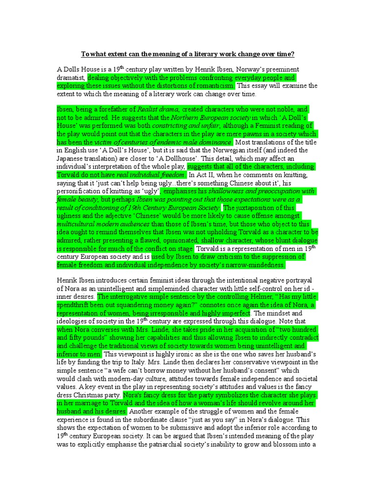 Our first impressions of Nora, Torvald, and Krogstad are all eventually undercut. Torvald, though he plays the part of the strong, dolls house essay, benevolent husband, reveals himself to be cowardly, petty, and selfish when he fears that Krogstad may expose him to scandal. Krogstad too reveals himself to be a much more sympathetic and merciful character than he first appears to be.